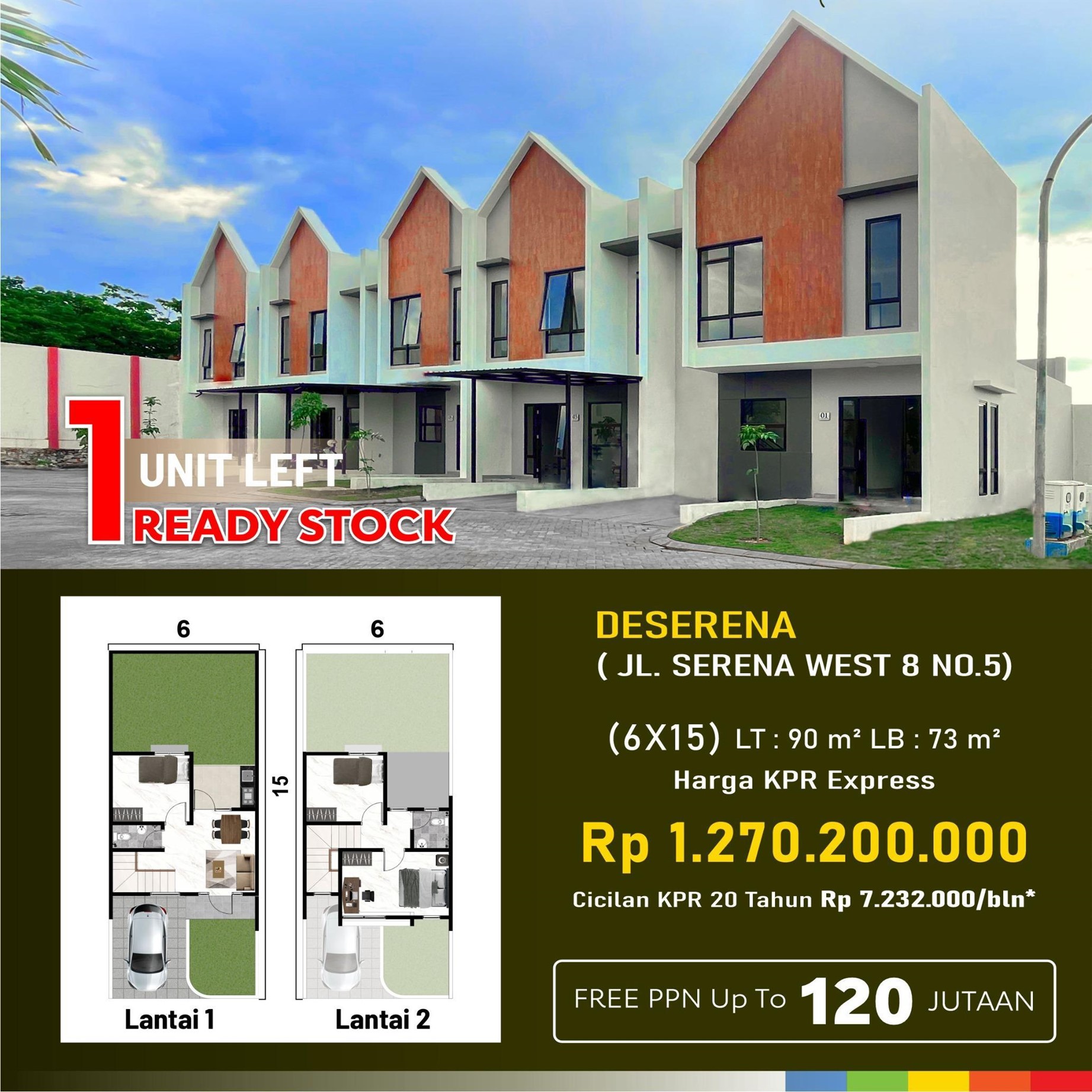New Deserena cluster 2 lantai menawarkan hunian nyaman dan modern dengan lingkungan yang asri dan aman. Dirancang untuk menunjang gaya hidup keluarga masa kini, setiap unit memiliki desain elegan, pencahayaan alami, serta sirkulasi udara yang baik. Fasilitas umum seperti taman, tempat ibadah, dan area bermain anak turut melengkapi kenyamanan Anda. Lokasinya strategis, dekat dengan pusat kota, sekolah, dan akses transportasi utama. Hunian ideal untuk masa depan.